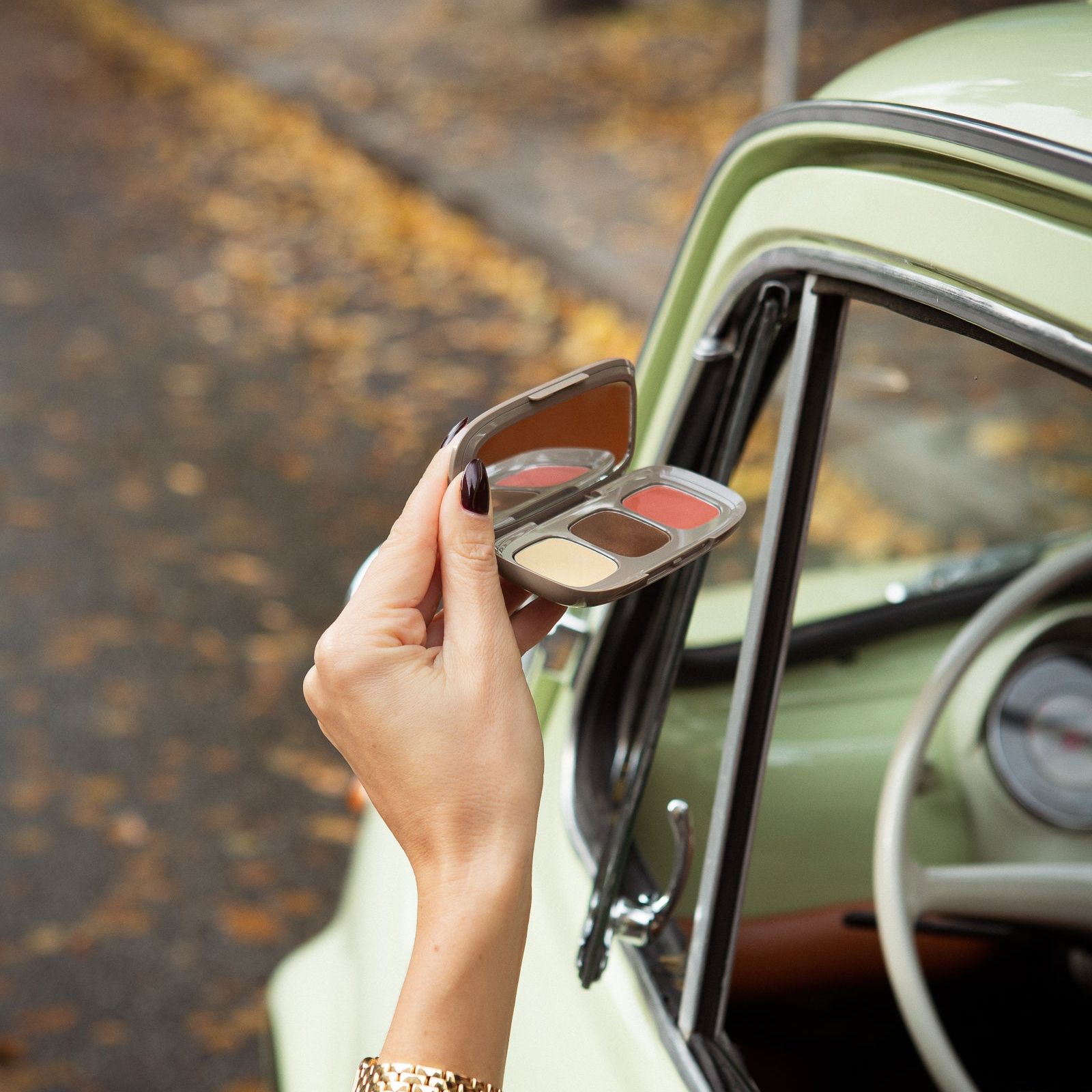 Paletten kommer i en lyxig, guldig förpackning med spegel – perfekt att ha med i handväskan för enkel användning när som helst, var som helst.